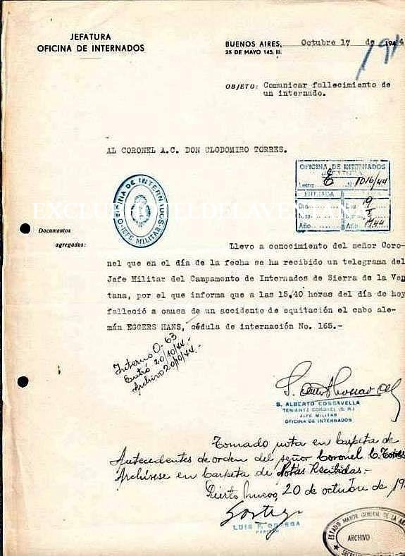 17 de octubre de 1944, el oficial Johannes Eggers, marinero del Graff Spee internado en el Club Hotel de la Ventana fallece en un accidente de equitación. Se le desbocó el caballo que montaba (era domador a pelo) y se golpea contra un arbol cercano y se desnuca.
